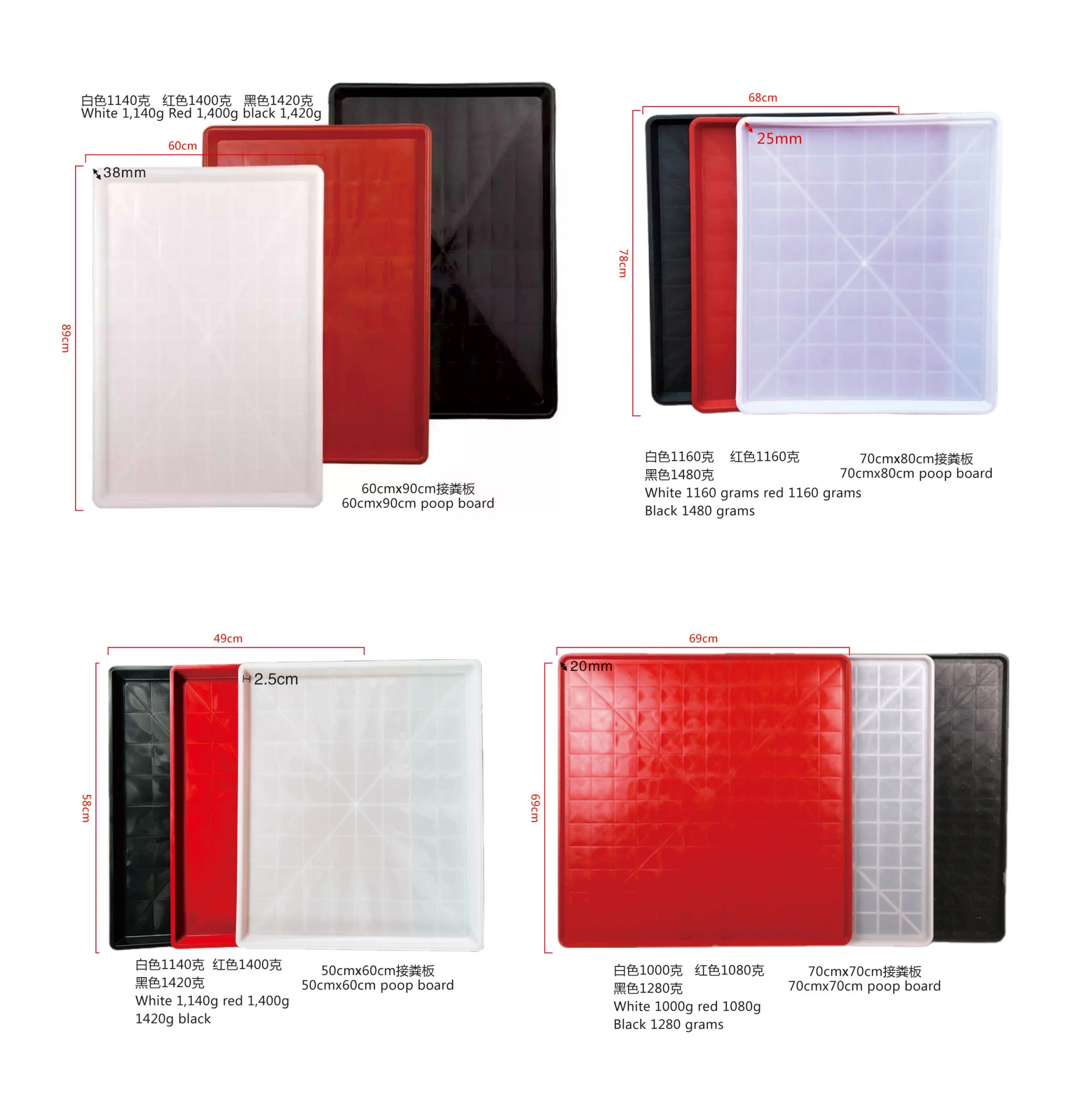 70cm × 80cm manure collection board: with a size of 70cm × 80cm and a thickness of 25mm, it comes in three colors: white (weighing 1160g), red (weighing 1160g), and black (weighing 1480g). It is suitable for medium-sized breeding scenarios and provides manure collection function for poultry activity areas.