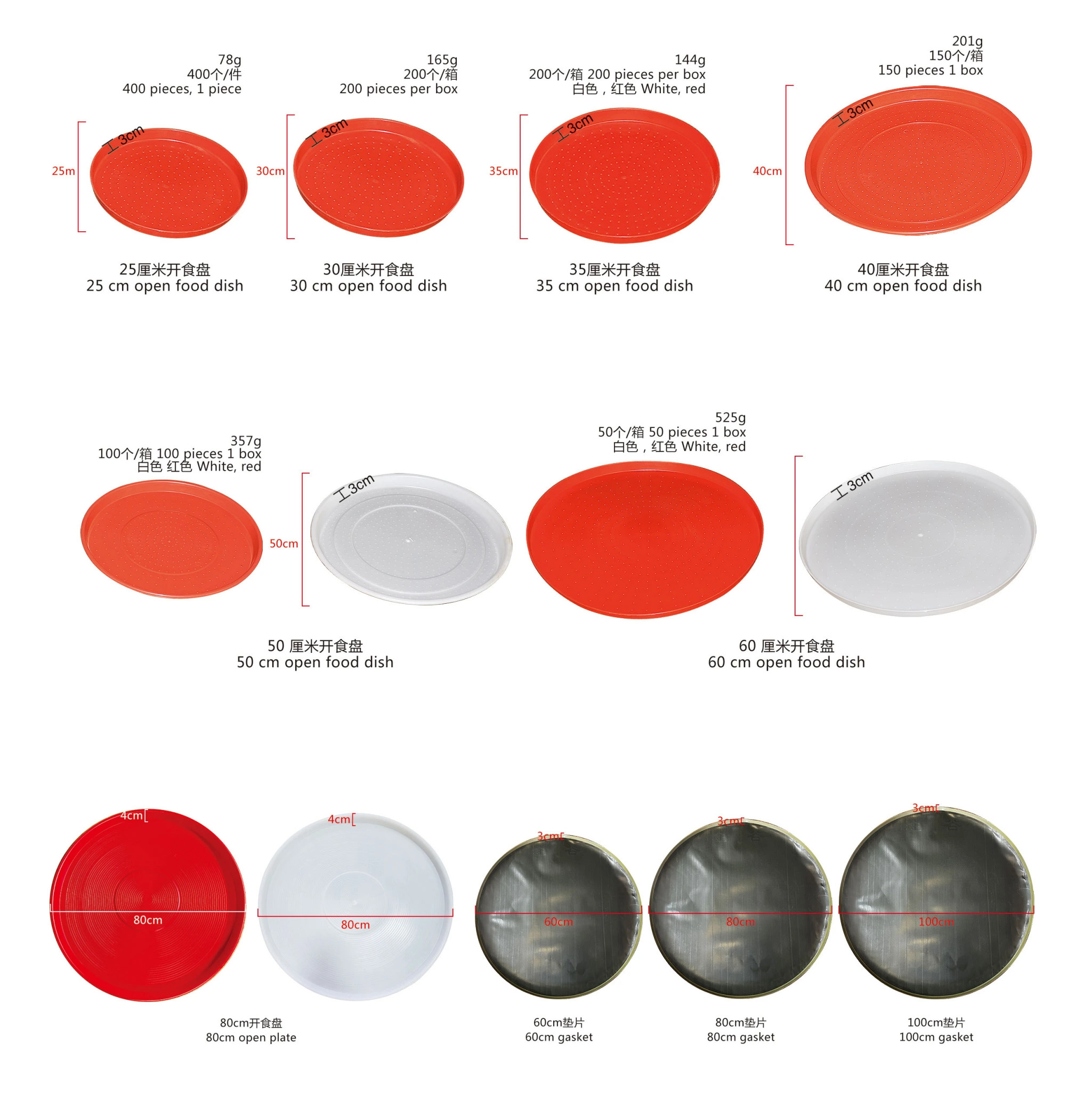 60cm opening tray: with a diameter of 60cm and a weight of 525g per piece, available in white and red colors, with 50 pieces per box. It is the largest size in a regular opening tray and suitable for feeding large flocks of poultry.