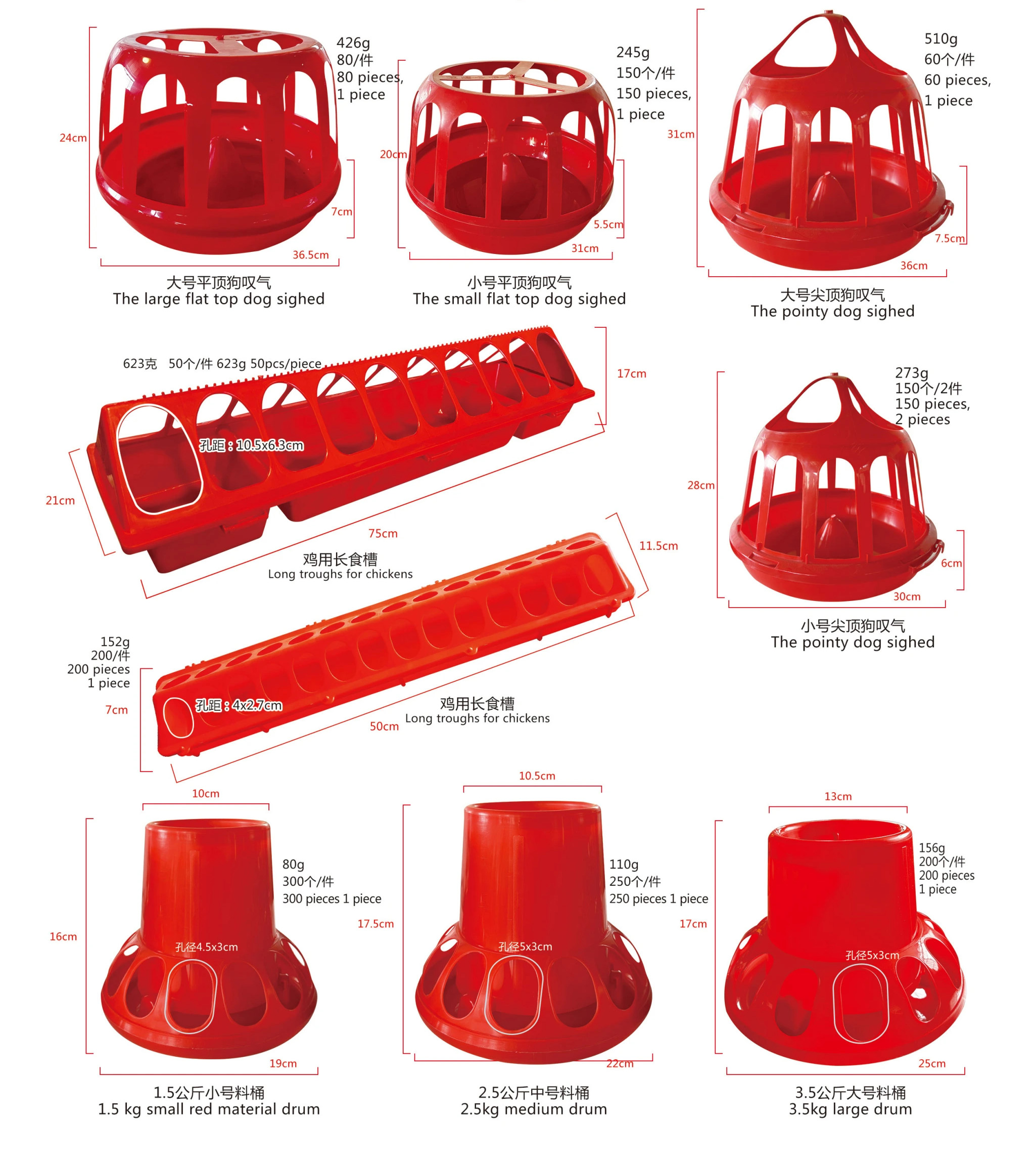 2.5-kilogram medium-sized feeding bucket: 17cm high, 22cm bottom diameter, weighing 110g per piece, with 250 pieces per piece. The bucket has a 5x9cm aperture and moderate capacity, suitable for feeding growing poultry and can meet the feed supply for a certain period of time.