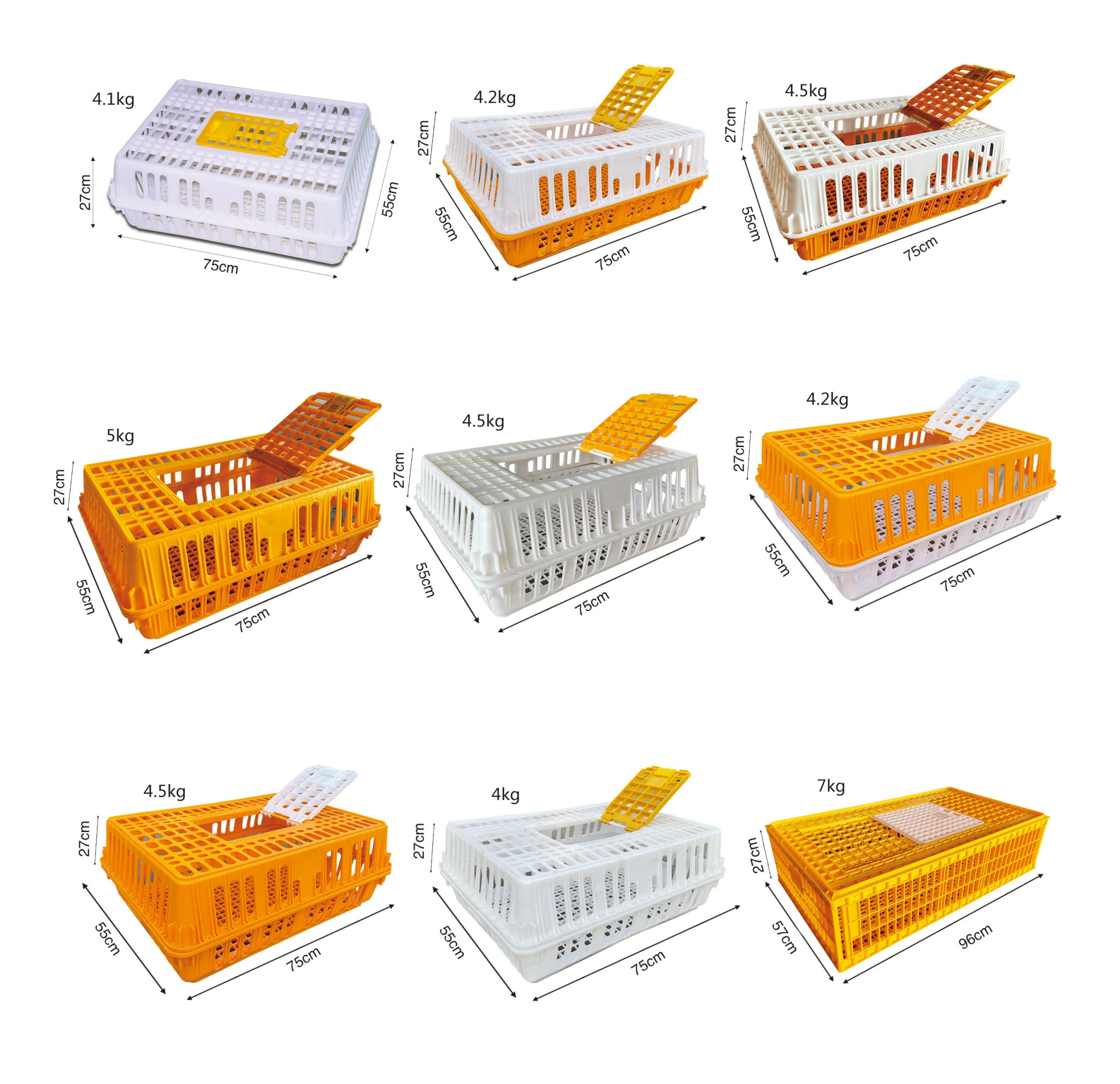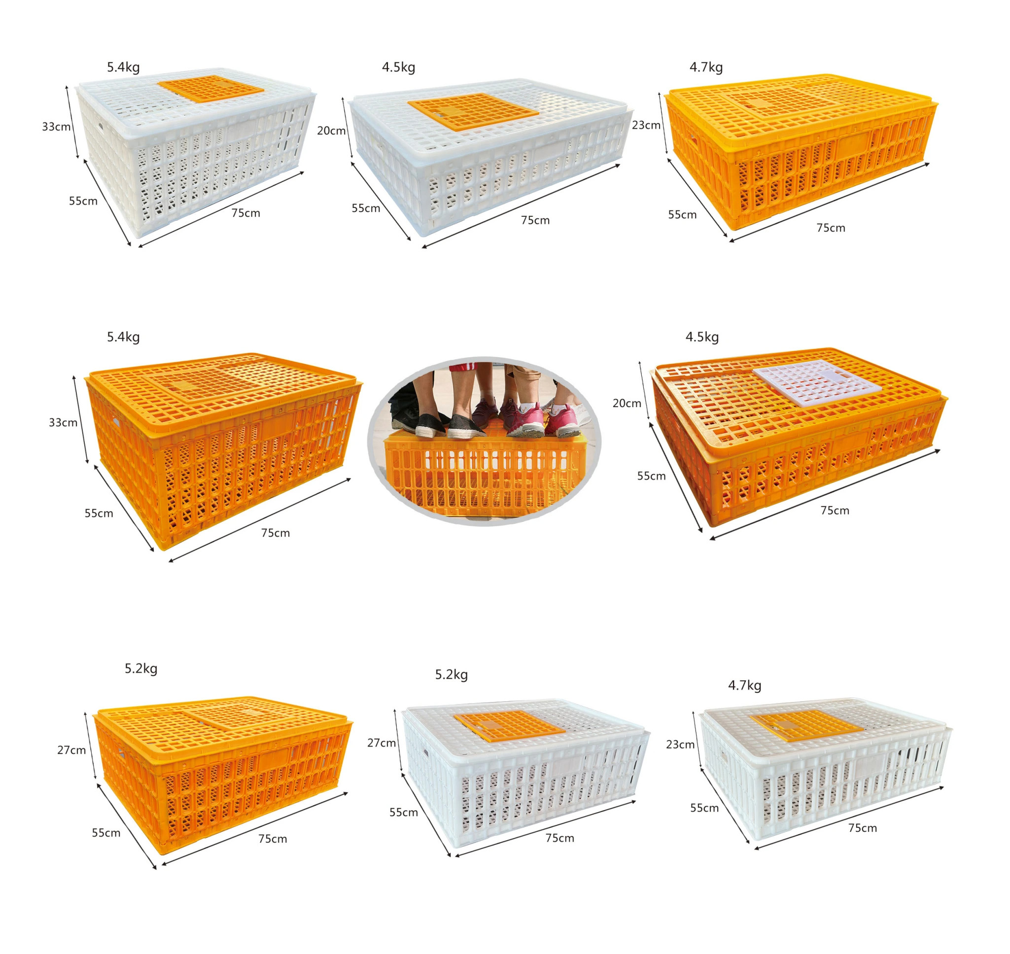 There are various specifications, including 750550230mm, 750550270mm, 750550330mm, 950560260mm, etc. The weight and carrying capacity of turnover boxes of different specifications vary to meet the transportation needs of different quantities and types of poultry.