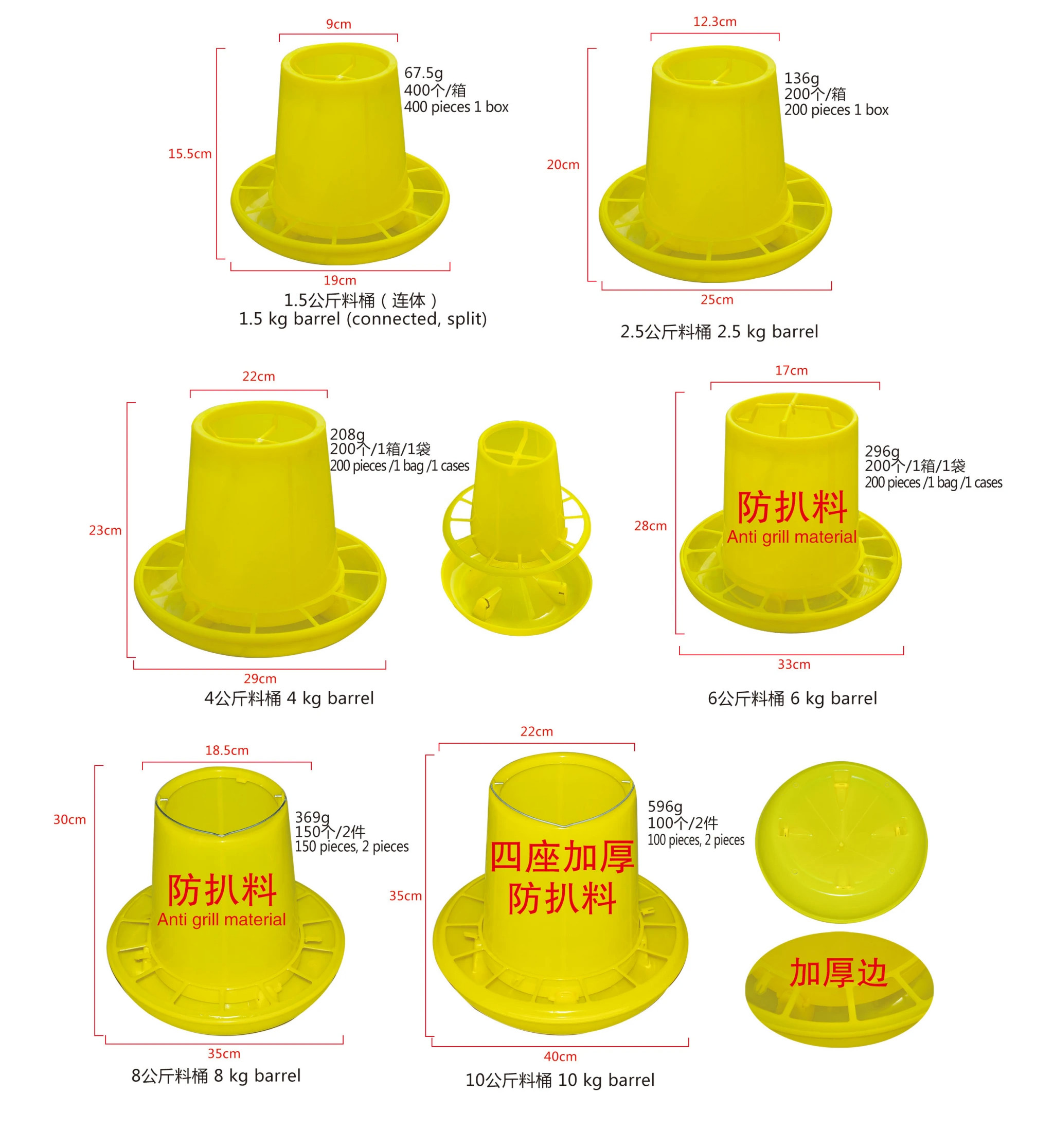 1.5 kg material bucket (connected): 15.5cm high, 19cm bottom diameter, individual weight 67.5g, 1 box for every 400 pieces, small capacity, suitable for early feeding of chicks or small poultry.