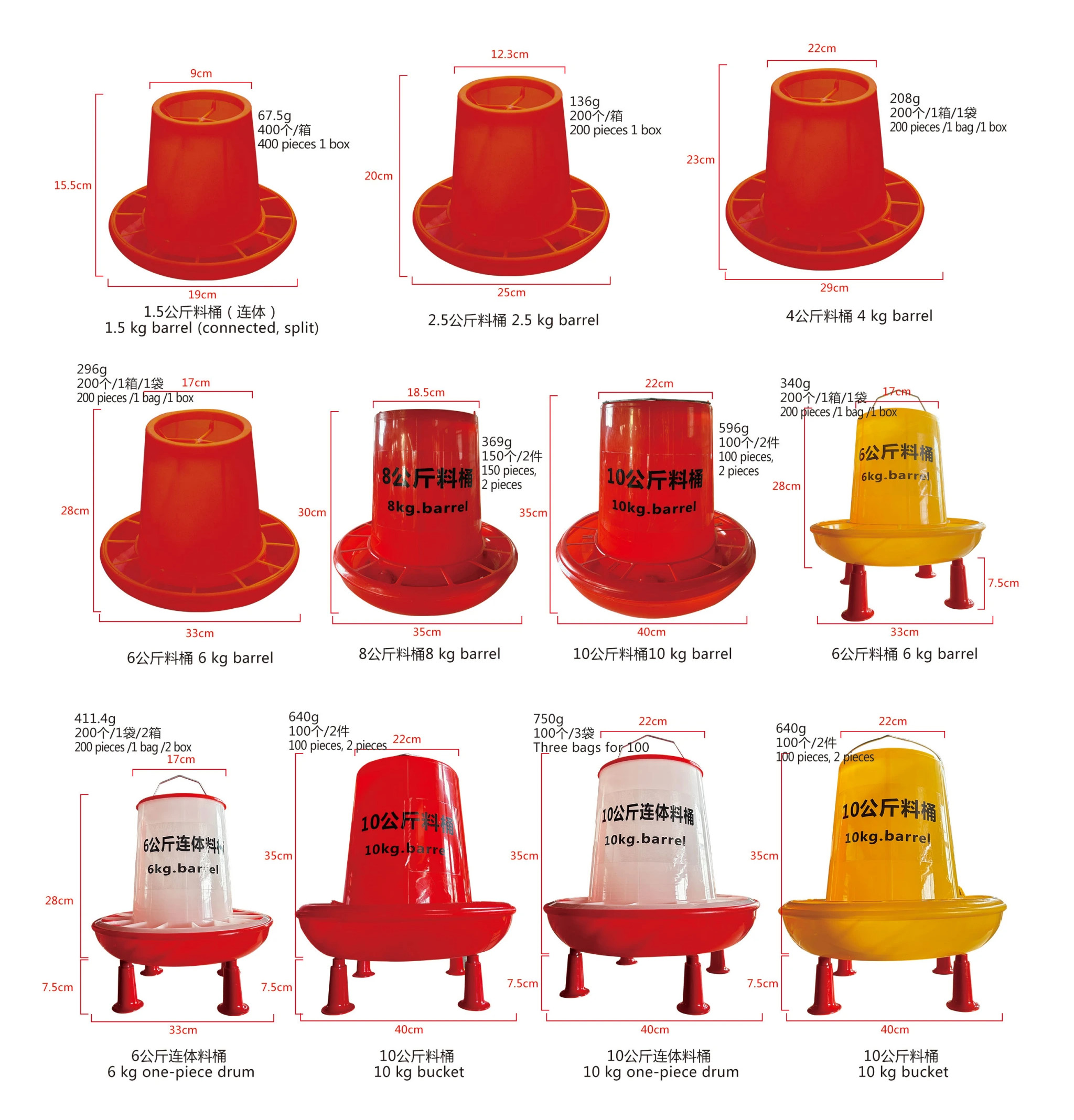 Leg connected material bucket (6kg, 10kg): with supporting legs at the bottom and a height of 7.5cm. If the weight of the 6kg connected material bucket is 411.4g, every 200 pieces are 1 bag/2 boxes; There are red and yellow versions of the 10kg integrated feeding bucket, with the red weighing 640g and the yellow weighing 640g. There are 2 pieces per 100. The leg design can prevent the bucket from directly contacting the ground and keep the feed clean.